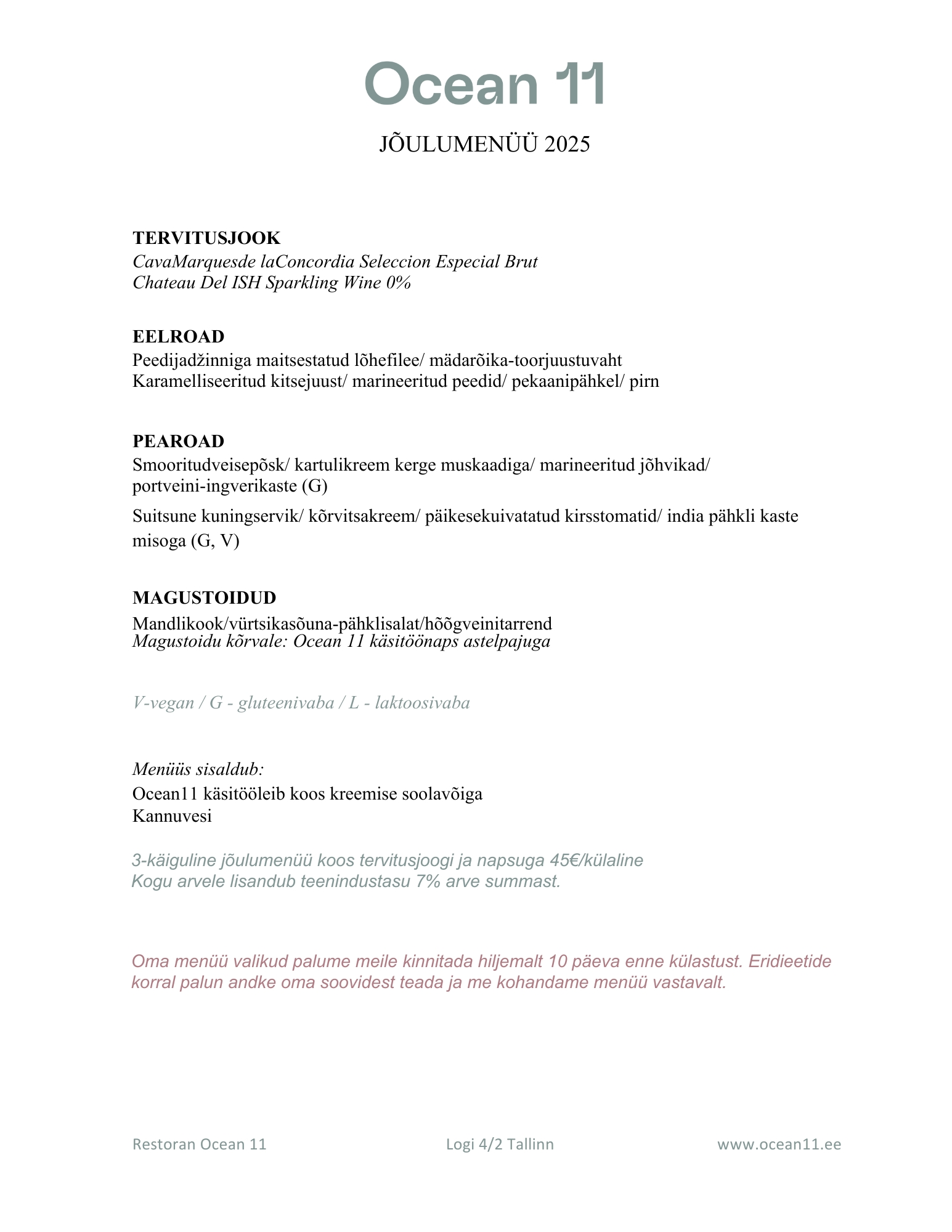 Tule korralda oma jõulupidu mereäärses Ocean 11 restoranis ja naudi pidulikku meeleolu koos maitsva jõulumenüüga.