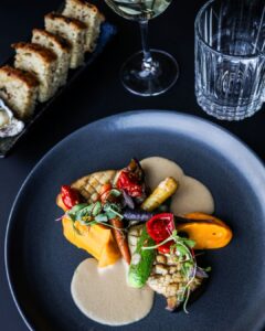 Roasted duck breast (G) with carrot purée / seasonal vegetables / cranberry-thyme sauce