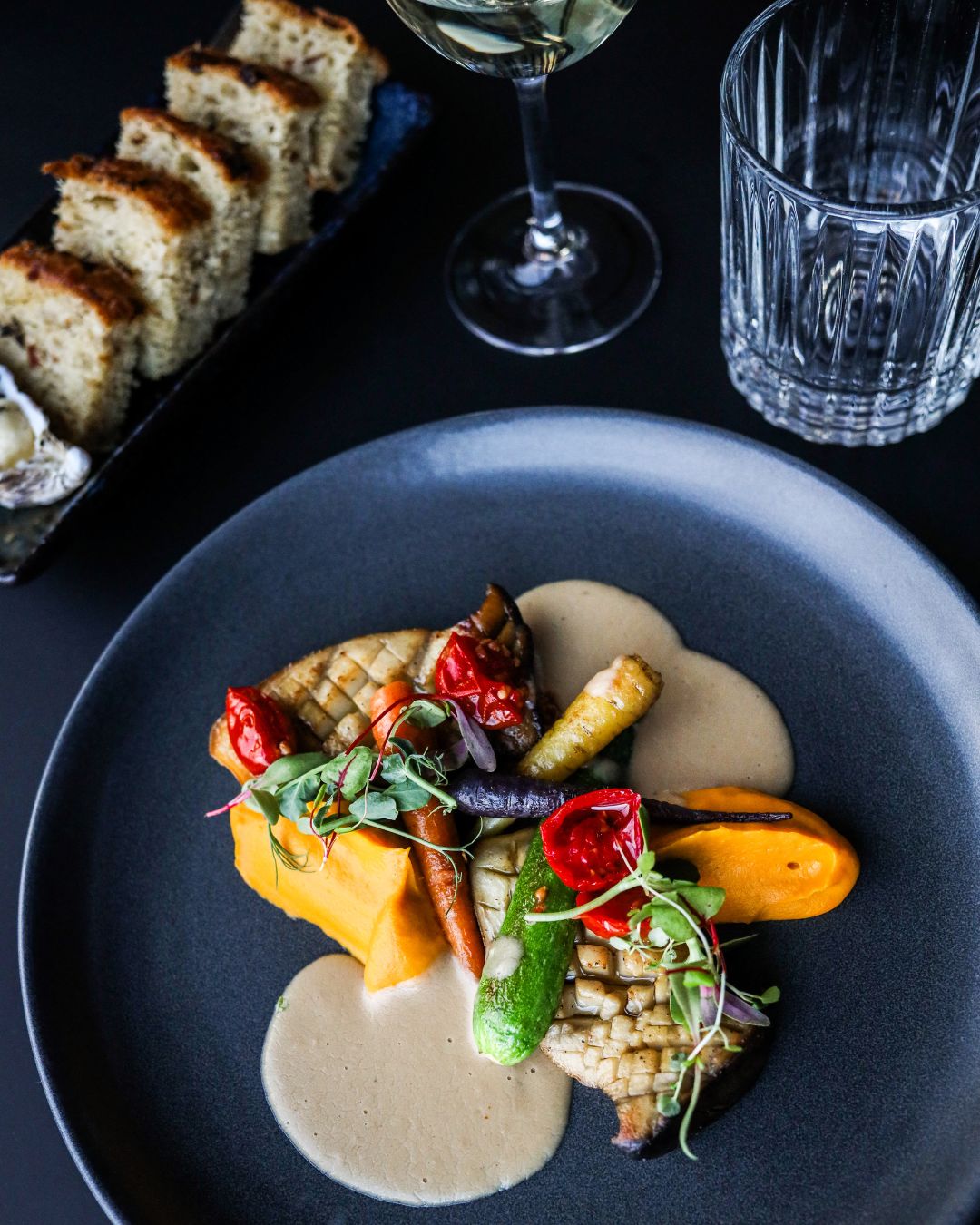 Portobello steak (V) with pumpkin purée / sun-dried cherry tomatoes / cashew–miso sauce